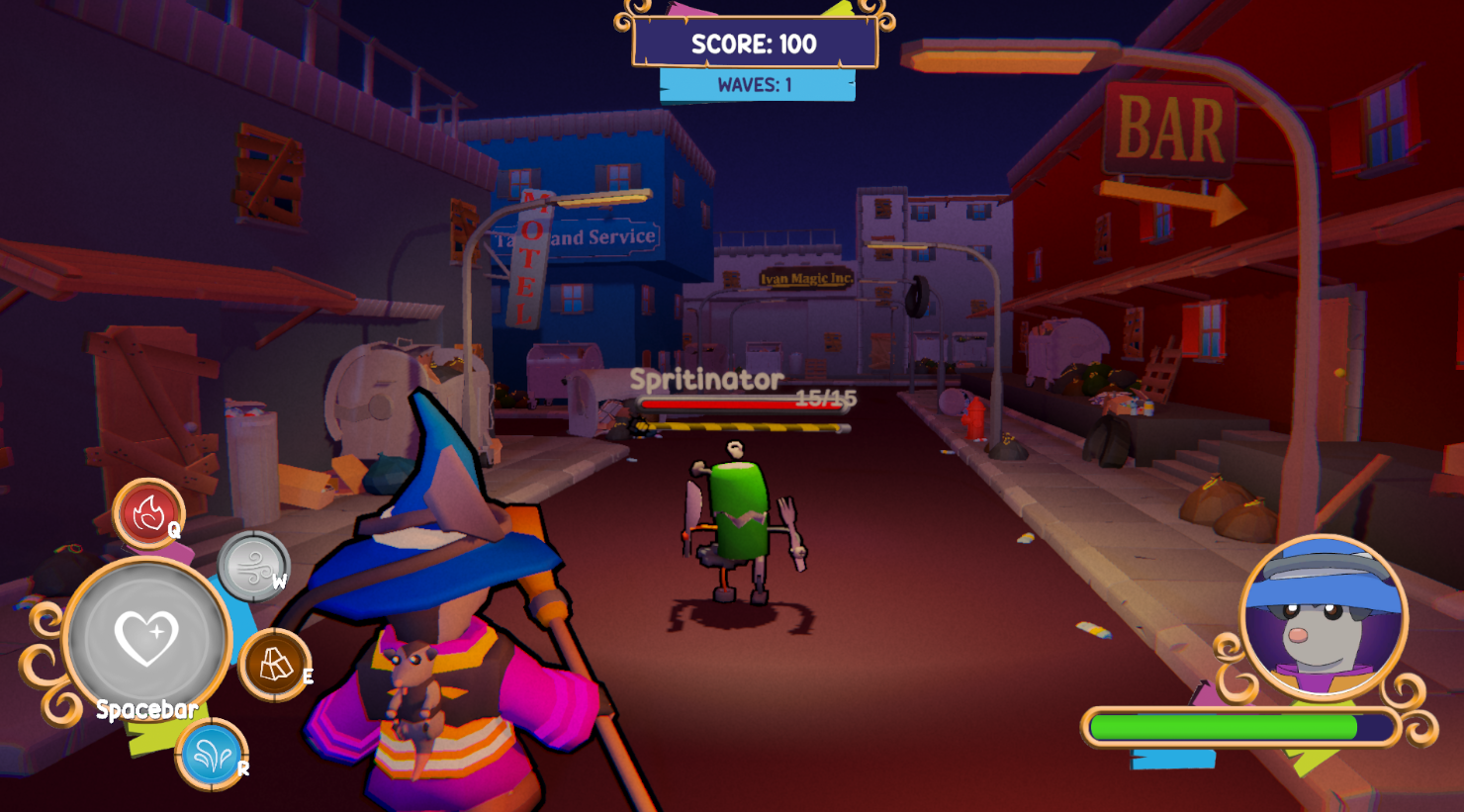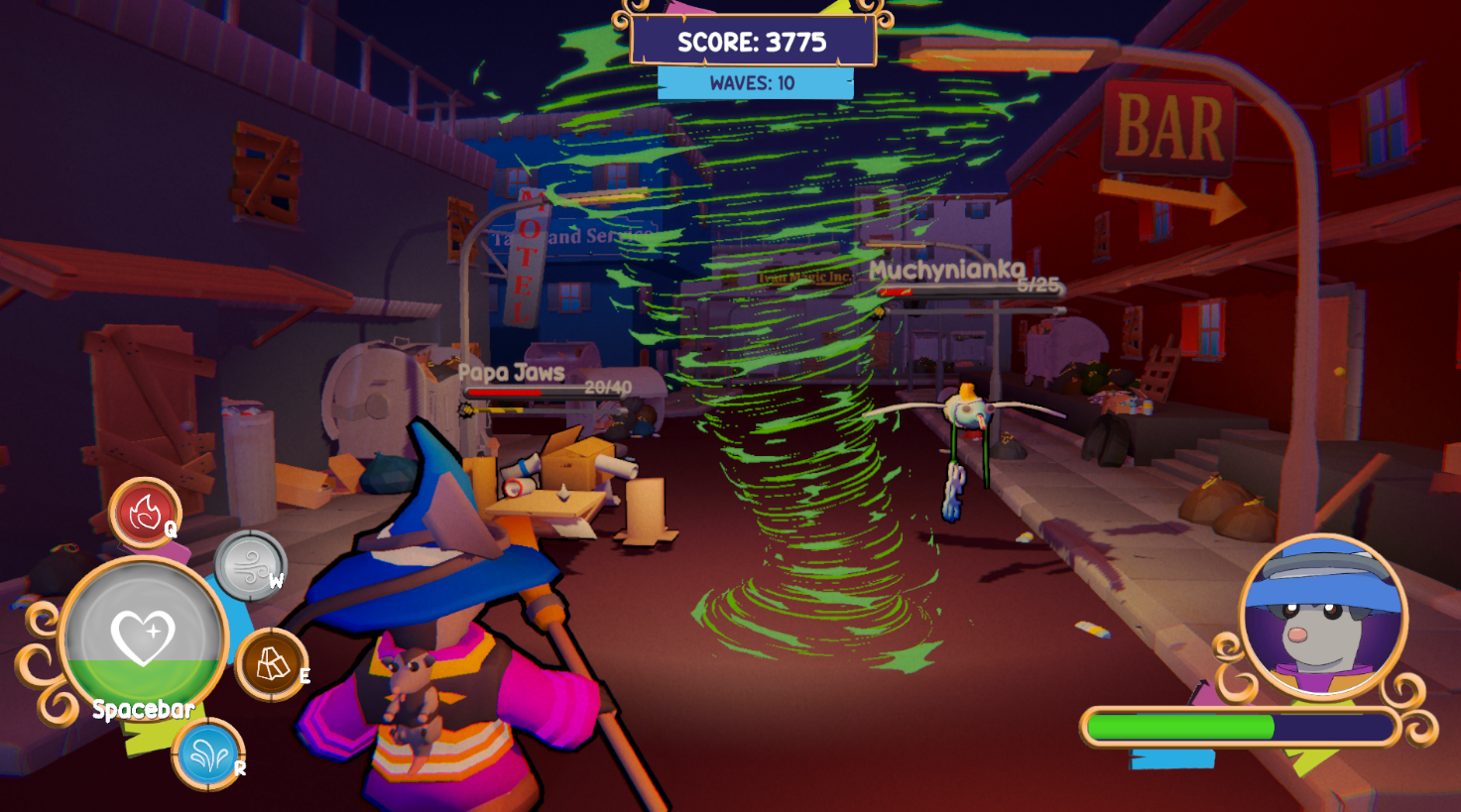 You are the Wastemancer, a magical possum fighting trash! Using only the arrow keys to cast elemental attacks—fire, water, wind, and earth—to defeat waves of unrecycled monsters in a fast-paced, high scoring arcade game.